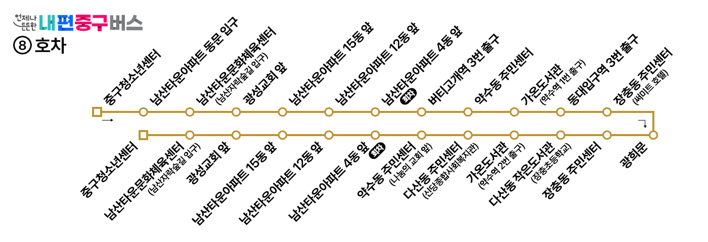 - 1호차 ~ 남산타운A 장날에는 4동 앞에 정차하지 않습니다.